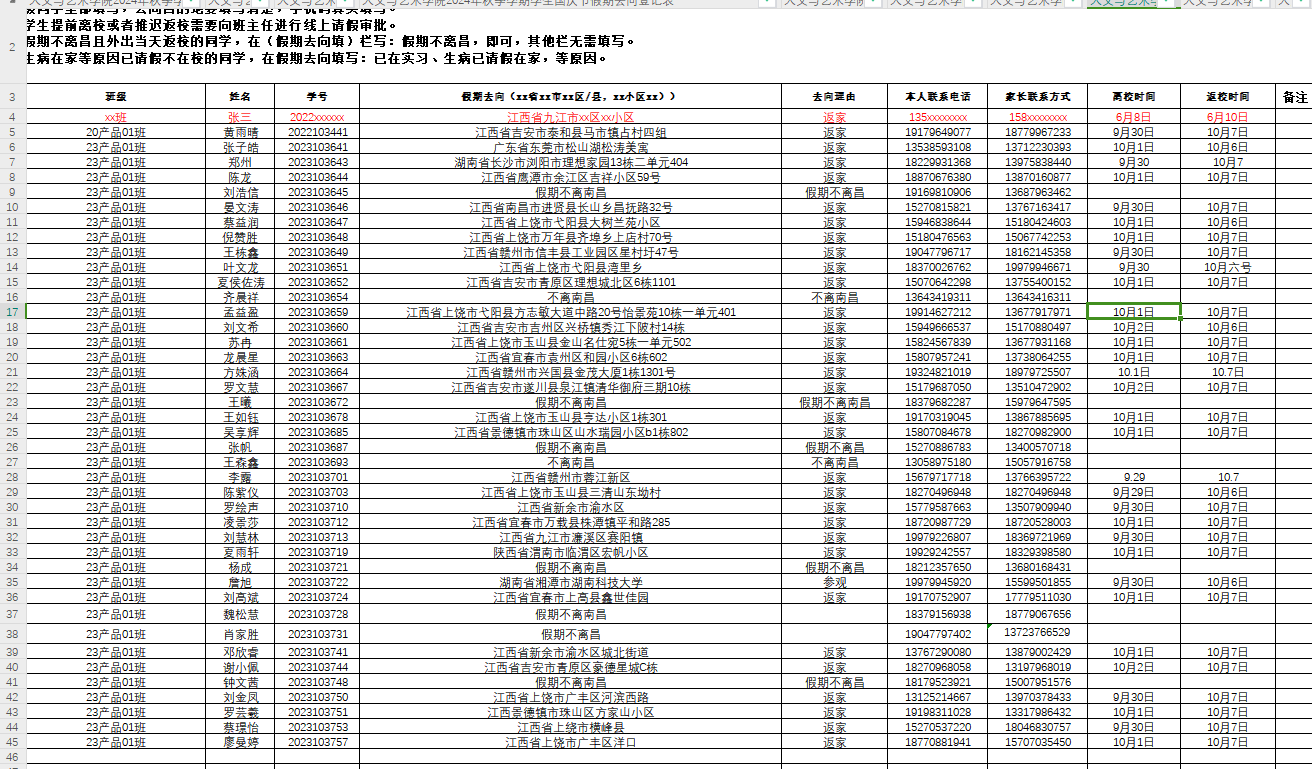学院认真落实学校关于安全稳定的工作要求,增强防范意识和责任观念,将学生安全工作抓紧、抓实,排查各类安全隐患,确保学生人身、财产安全。一是学生假期去向登记。组织召开班主任工作会议,严格落实学生离校去向登记制度,准确掌握留校学生人数,离校学生目的地、联系方式及返校时间。制作收集《2024年春季学期学生端午假期去向登记表》和《2024年春季学期端午假期未按时返校学生情况统计表》,熟悉掌握学生假期动态去向,明确学生假期外出安全责任。二是加强安全主题教育。通过主题班会和教育媒介引导学生合理安排假期学习、生活,学生,要求学生牢固树立底线思维和安全红线意识,不断增强安全意识和应对紧急情况的能力。三是开展宿舍卫生安全检查。严格排查学生夜不归宿、使用违章电器、留宿他人等现象,发现违纪学生严肃处理。禁止学生参加格调低下、封建迷信、不利于身心健康成长的活动和不利于社会稳定的活动。对违反纪律的单位或个人,按照学校管理规定追究责任、严肃处理。