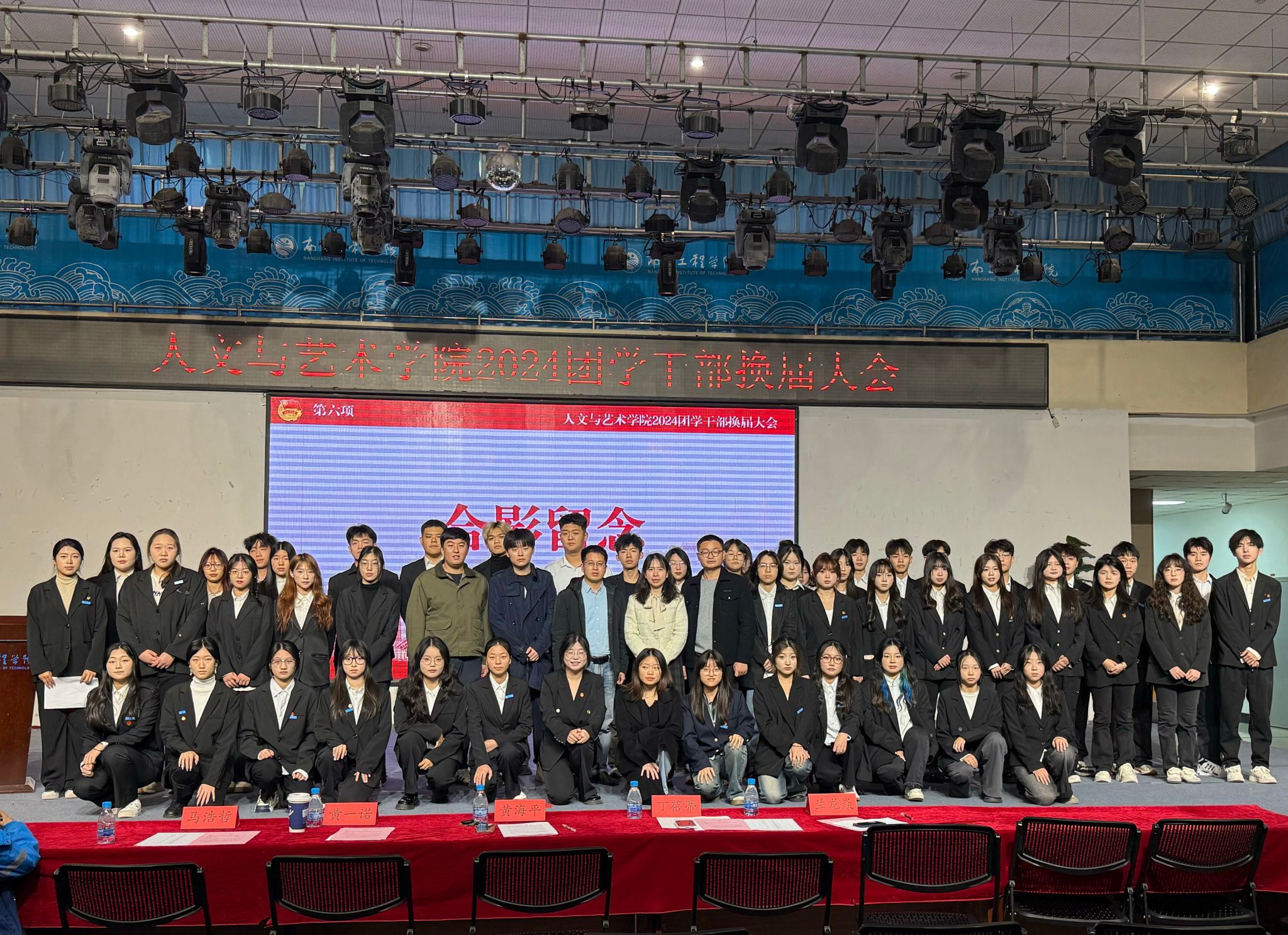 为进一步推动学生干部组织的传承,激发学生参与校园活动的热情,人文与艺术学院于11月28日在大学生活动中心多功能厅举行2024年团学干部换届大会。活动由院党委副书记黄海平、院团委书记兼学工办主任丁蓓蒂、辅导员黄一诺、兰龙焱、马浩哲出席,24级全体团学干部参与。