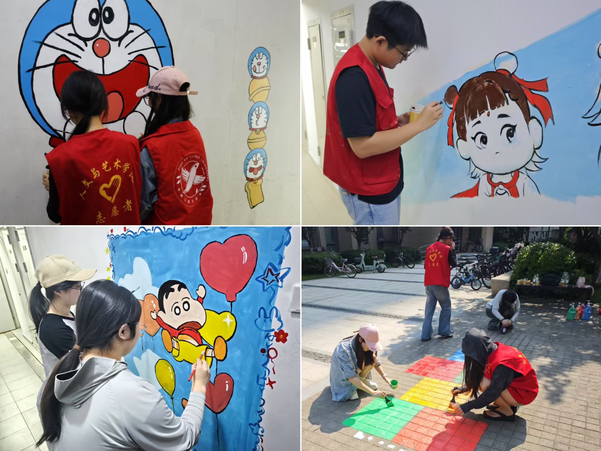 当日上午,学生团队携带环保丙烯颜料与专业画具,针对社区老旧楼梯转角、儿童游乐区墙面及室外休闲广场地面等区域展开创作。同学们结合社区居民建议,以“童趣乐园”为主题,用流畅线条勾勒出会“说话”的卡通动物、会“微笑”的动漫图案墙绘,斑驳的墙面焕然一新。在室外彩绘环节,团队创新设计“彩虹跳房子”地面互动装置,用渐变色块与卡通脚印串联出童趣步道,吸引孩童争相体验。
