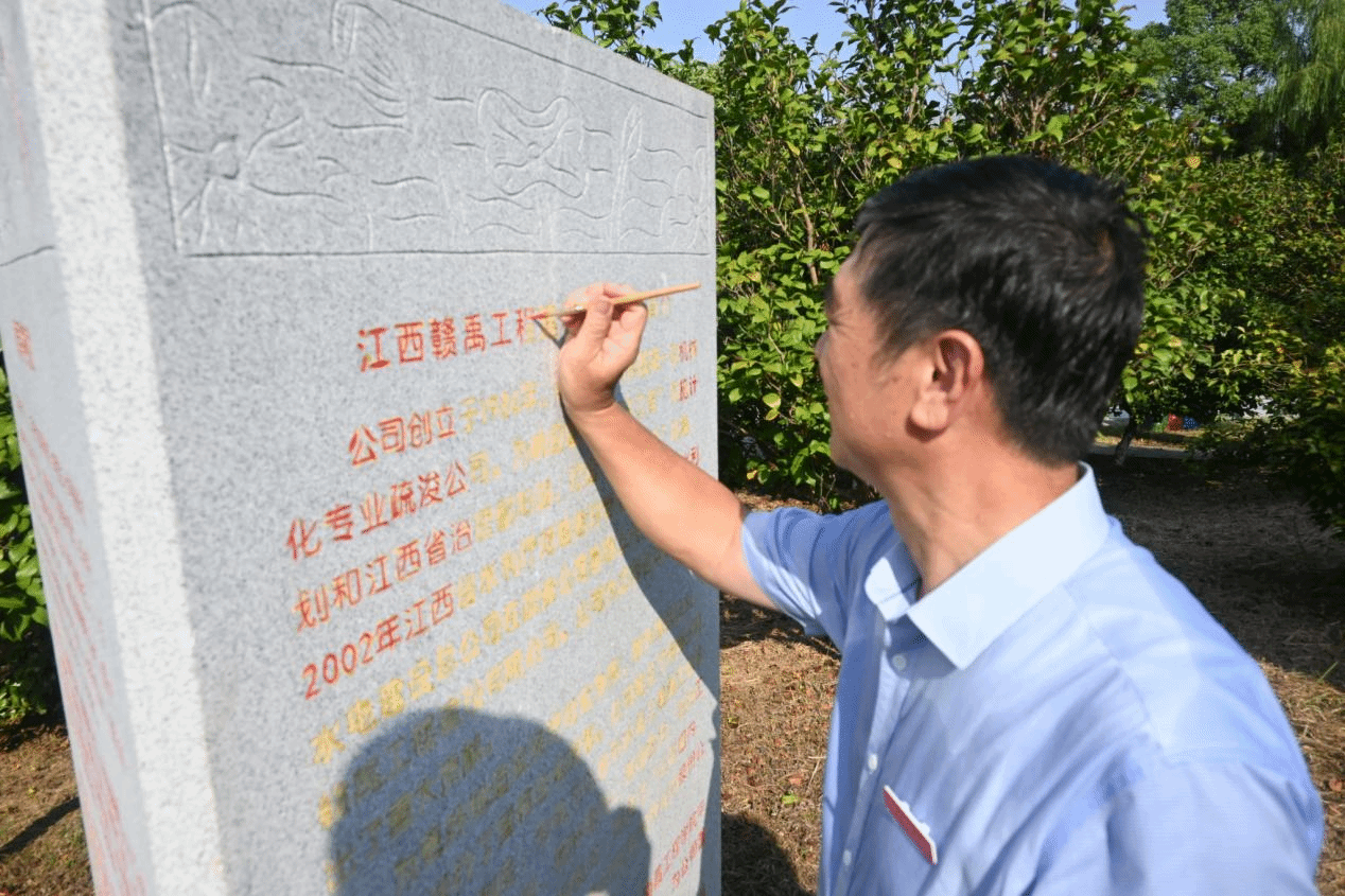 活动现场,吴泽俊副书记以“赣禹亭”建亭历史为脉络,结合碑铭文字与亭廊意境,为志愿者们讲述了历史治水智慧、当代水利精神与青年使命担当,让大家在服务前先深入理解文化内核。随后,志愿者们手持笔墨工具,以专注细致的态度为“赣禹亭”碑文字迹进行描红修复:从起笔到收笔,耐心补全褪色笔画,在一笔一划的描摹中,既守护了校园文化景观,也体悟到先辈治水的坚韧与校友反哺的赤子情怀。