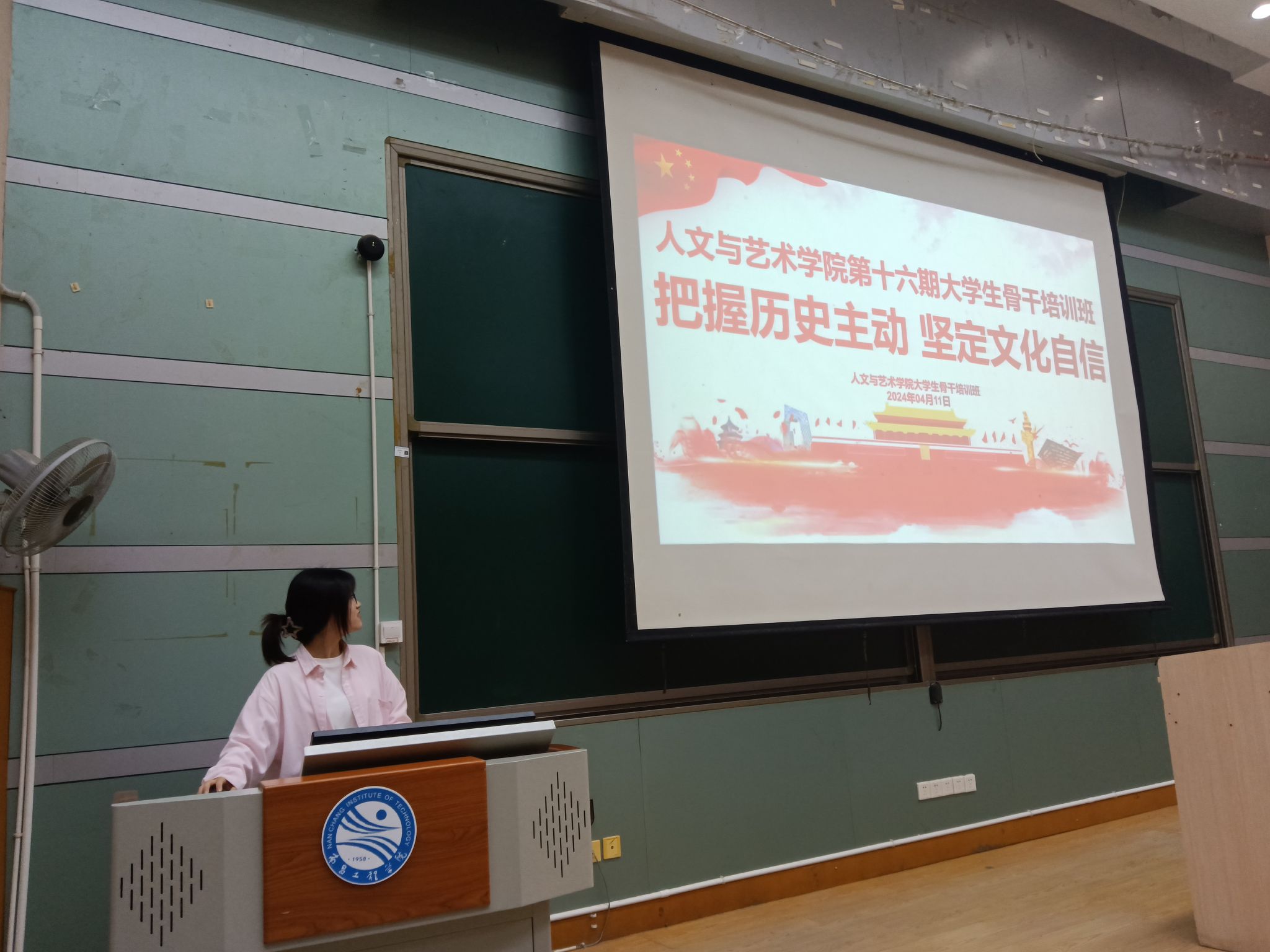 为引导学生干部坚定文化自信,传承和发扬中国优秀传统文化,人文与艺术学院于4月11日在北教学楼C104开展“把握历史主动,坚定文化自信”大学生骨干培训课堂。