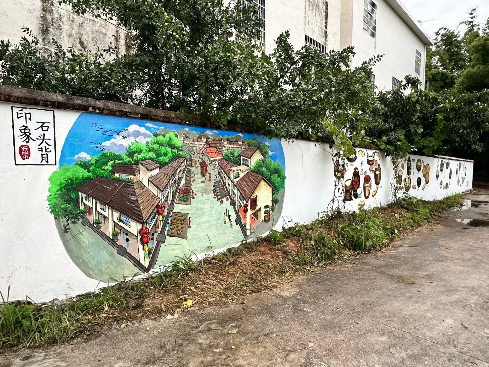 实践团成员通过挖掘石崇村独特风情与故事,提炼精髓融入设计,反复推敲,力求每一线条、每抹色彩都能精准传达地域特色。至绘画阶段,以笔为舟,以墨为帆,在空白的墙面上绘制。面对长时间的体力消耗和炎热的天气,然而每当想起原本单调的墙壁在他们的笔下焕发出新的生命力,那份成就感便足以驱散所有的疲惫与困难。