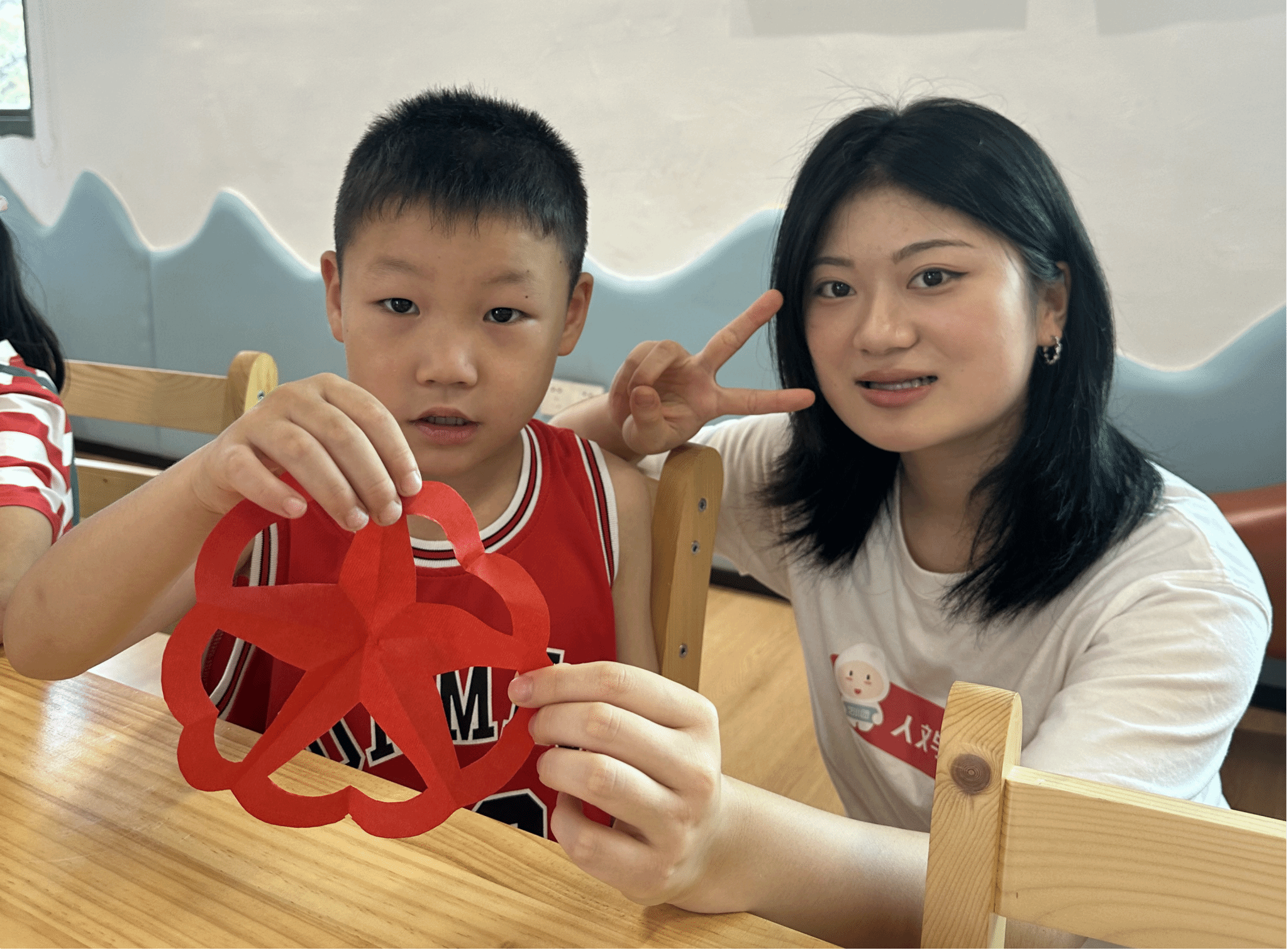 活动伊始,实践团成员带领孩子们回顾了新中国成立65年来的辉煌成就,随后讲解了剪纸的历史、技巧以及五角星所代表的深刻寓意,通过详细的步骤演示,指导孩子们亲手制作红色主题剪纸作品。孩子们在动手实践的过程中,不仅锻炼了手眼协调能力,更深刻体会到了剪纸艺术的魅力。