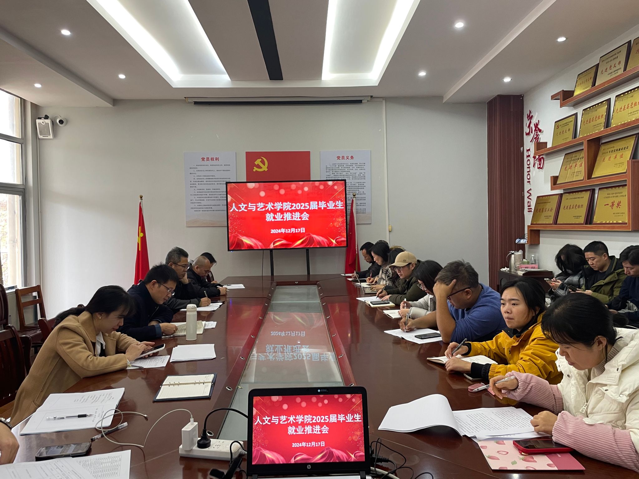 12月17日,人文与艺术学院成功召开 2025 届毕业生就业推进会。会上,各教研室主任、专业负责人、毕业班班主任依次发言,详细汇报了近期就业工作的开展状况,深入剖析工作中的难点问题,并提出下一步工作计划。他们对班级学生就业意向、已就业情况等数据进行了精准分析,为后续就业推进工作提供了有力依据。