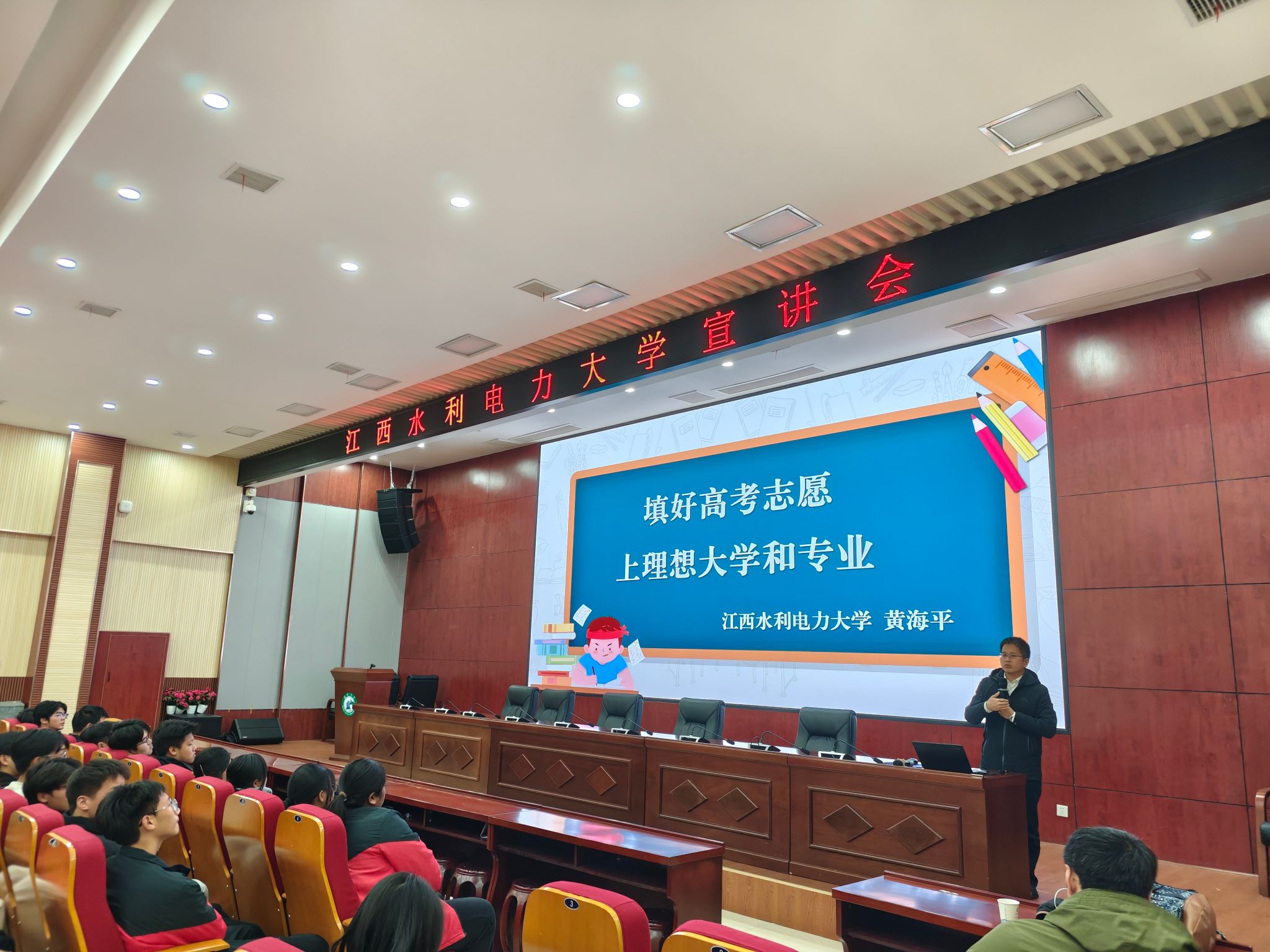 活动中,许宁老师详细介绍了我校悠久的办学历史与鲜明特色以及人文与艺术学院的学科优势与培养理念。黄海平则紧扣高考动态,深度解读了志愿填报策略与最新政策走向,并结合职业生涯规划理论,为同学们现阶段的学习备考提供了清晰务实的建议。现场互动频繁,反响热烈。与会学生纷纷表示:“今天的科普讲座分享非常及时,让我们对江西水利电力大学校史校情有了更加深入的了解,清晰认识到大学专业选择重要性,也明确了接下来复习备考方向。”(文/图 兰龙焱、许宁)