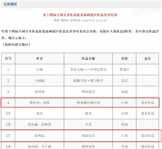 据悉,全国美展是由文化和旅游部、中国文学艺术界联合会、中国美术家协会联合主办,代表中国美术最高水平的综合性大展,每五年举办一次。本届全国美展共分为13个分展区,漆画展区共收到投稿作品近五千余件,经过两轮评审最终评选出入展作品201件,其中进京作品27件(江西省入选作品14件,其中进京作品7件)。油画展区入选作品699件,其中进京作品95件。进京作品将于展览结束后由各分展区统一送至中国美术馆,并在75周年国庆期间集中展出。