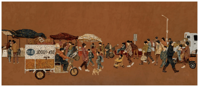 (漆画 刘伟 《熙来攘往烟火间》 80cm×180cm)