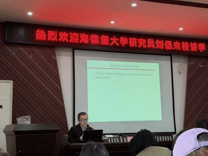 2025年12月3日,海德堡大学跨文化研究中心研究员、SSCI与A&HCI收录期刊客座编辑刘倡应邀在艺术楼A230会议室,为在场师生带来了一场题为“国际学术期刊的选题、写作与投稿”的专题报告。本次讲座旨在帮助师生更好地掌握国际学术发表规范,提升论文质量与录用率。