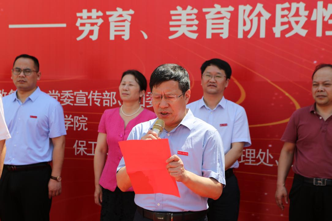 陆伟锋强调,学校历来提倡以美育人、以文化人,近年来先后出台《南昌工程学院劳动教育实施方案》《南昌工程学院美育教育实施方案》,全力构建“五育并举”教育体系,全面提高学生审美和人文素养,塑造学子尊重劳动、热爱劳动、崇尚劳动的品质。“以劳育美 以艺铸德”广大青年学子决不能局限于专业知识和技能,要有高远的精神追求,高尚的人格修养,广阔的胸襟,丰富的文学、艺术、哲学、历史的学养,以及深厚的人生感和历史感。希望广大教师和学生要进一步推进劳动教育、美育教育与人才培养有机结合,用脚步丈量祖国大地,用眼睛发现中国精神,用耳朵倾听人民呼声,用内心感应时代脉搏,把对祖国血浓于水、与人民同呼吸共命运的情感贯穿学业全过程、融汇在事业追求中,全面落实学校第三次党代会提出的目标任务,以优异成绩迎接党的二十大召开。