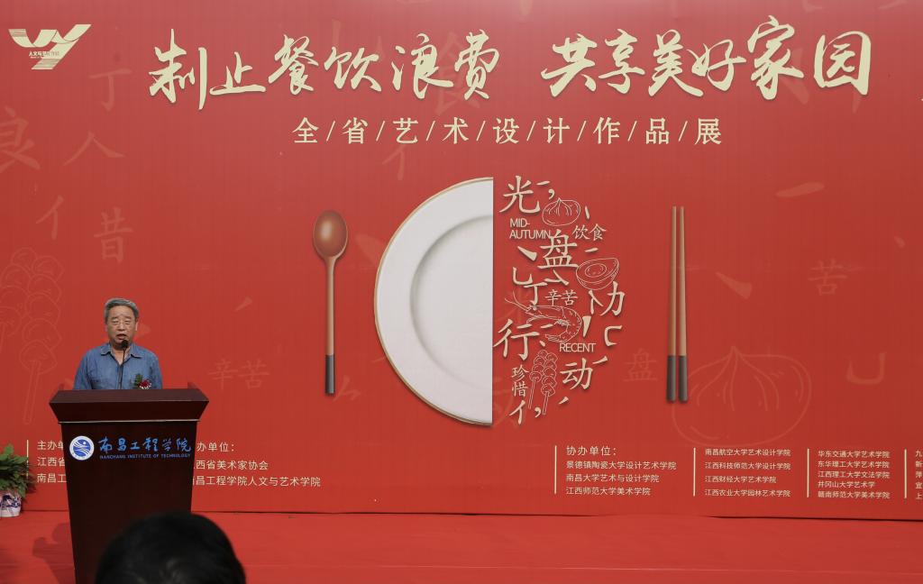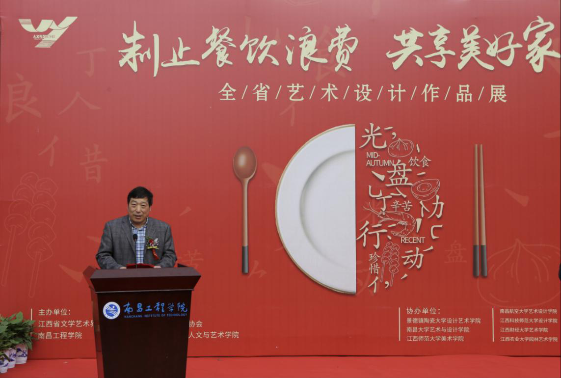 为了深入贯彻落实习近平总书记关于厉行勤俭节约、制止餐饮浪费的重要指示精神,响应全省自上而下发出的厉行节约倡议,在全社会营造浪费可耻、节约为荣的氛围,3月26日下午,“制止餐饮浪费、共享美好家园”江西省艺术设计作品展在南昌工程学院开幕。本次展览由江西省文学艺术界联合会、南昌工程学院主办,江西省美术家协会、南昌工程学院人文与艺术学院承办。原江西省政协副主席肖光明,原南昌大学党委书记郑克强,原江西省文联副主席、省美协主席蔡超,中国书法家协会副主席、中国美协理事、江西省文联副主席毛国典,南昌工程学院校长金志农、副校长汪胜前、周敏丹等出席开幕式,江西省美术家协会、江西省工艺美术学会、江西日报社、江西师范大学艺术学院、南昌大学艺术与设计学院、南昌工程学院党委宣传部、教务处、学工处、团委等相关负责同志以及南昌工程学院人文与艺术学院的师生参加了开幕式。开幕式由南昌工程学院纪委书记殷安全主持。