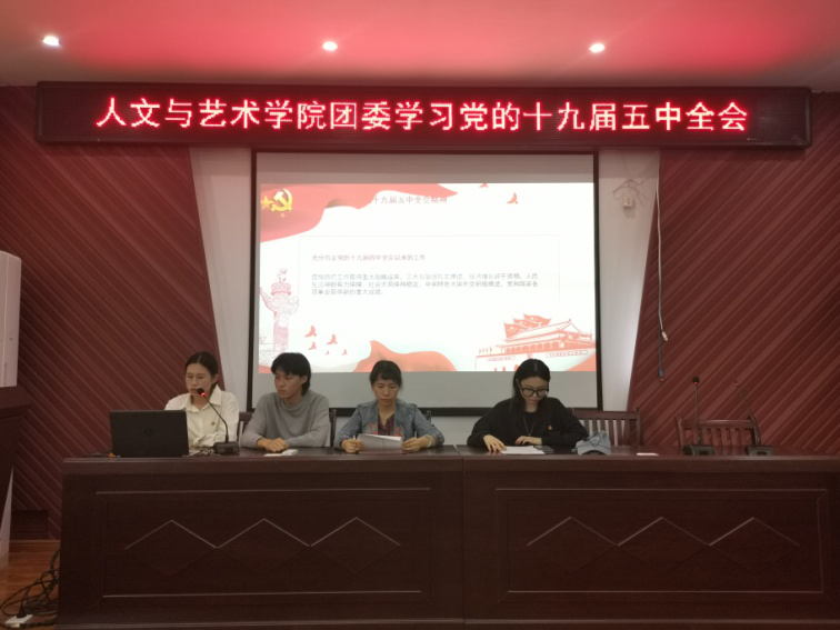 为深入学习贯彻习近平总书记在党的十九届五中全会上的重要讲话精神,人文与艺术学院团委于11月18日在艺术楼A230组织学习党的十九届五中全会精神。院团委副书记丁蓓蒂为主讲人,分团委学生副书记张星雨、组织部全体干事及全体团支书参与。