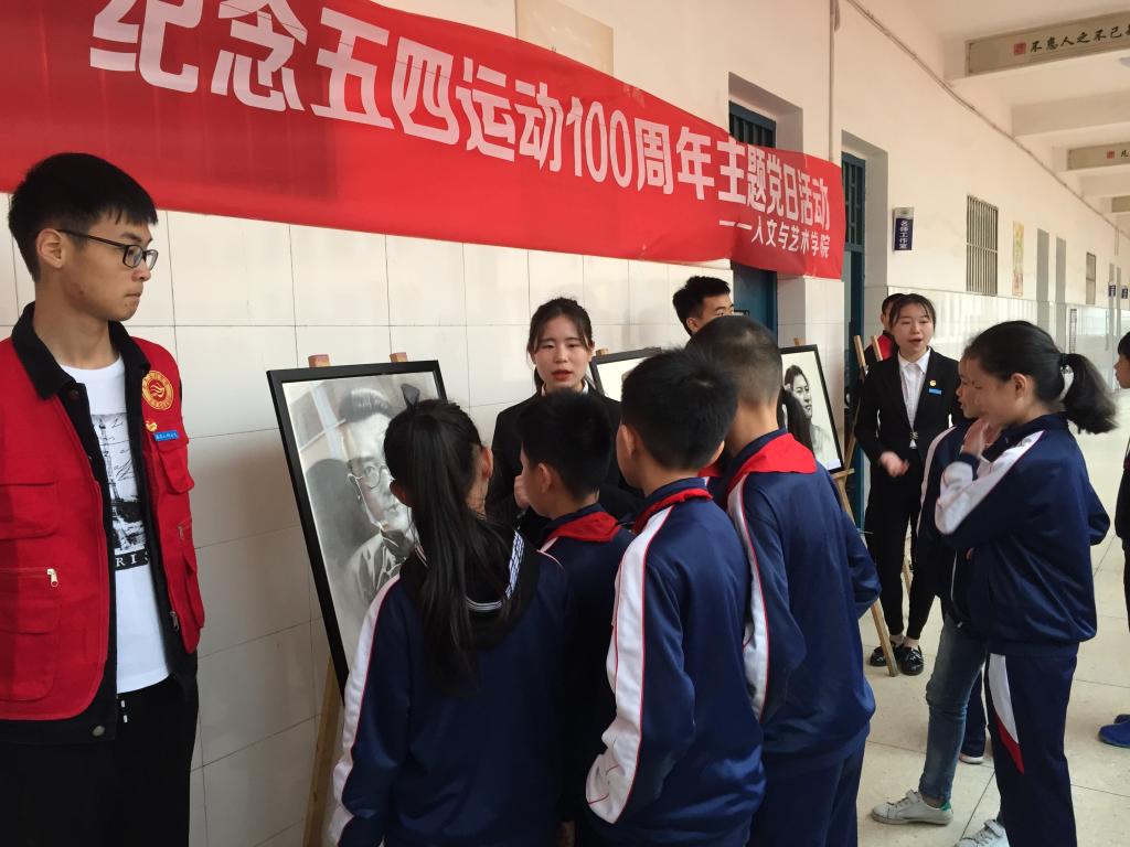 人文与艺术学院青年党员用画笔临摹了百年前以李大钊、陈独秀和胡适等为五四运动做出杰出贡献的代表人物,以及百年后弘扬和践行五四精神的优秀青年代表杨利伟、王成龙和刘翔等人物画像,以画展为载体,向中小学生们展示了优秀青年的风采,同时学院宣讲团的同学们讲解了这些不同时代楷模的事迹与奋斗历程,感染了在场的每一位学生。
