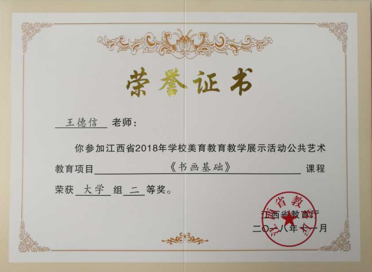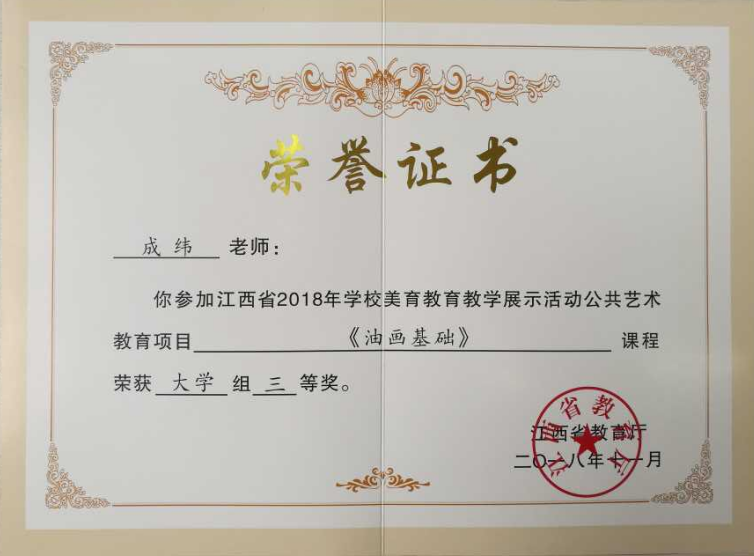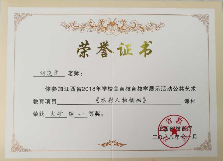 近日,接“赣教体艺字〔2018〕26号”文件通报,在江西省教育厅举办的首届学校美育教育教学展示活动中,我校人文与艺术学院选送的三门课程全部获奖。其中刘晓华的参赛课程《水彩人物插画》获得公共艺术教育项目大学组一等奖;王德信的参赛课程《书画基础》获得公共艺术教育项目大学组二等奖;成纬的参赛课程《书画基础》获得公共艺术教育项目大学组三等奖。(文、图/王丹)