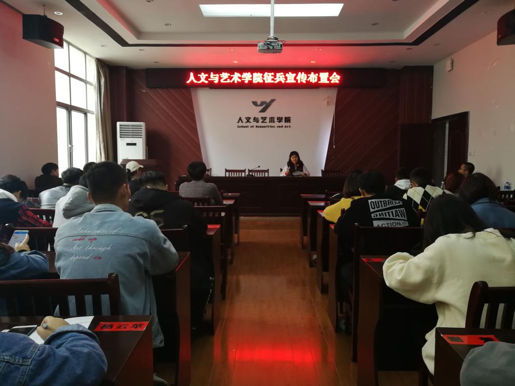 为帮助大学生了解、掌握应征入伍相关政策和流程,鼓励学生积极响应祖国号召,献身国防事业,3月27日中午,我院在艺术楼A230开展了2019年大学生征兵宣传布置会,学院学生工作办公室主任蒿佳杭、主要学生干部及各班班长参加了此次会议。